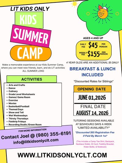 Don't miss out on this opportunity for your child to have a safe, fun, and LIT summer at LIT KIDS ONLY SUMMER CAMP!